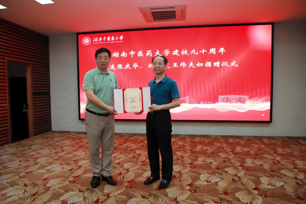 为祝贺学校建校90周年,1992级中医学专业校友、湖南方盛制药股份有限公司党委书记张庆华捐赠200万元,1990级中药学专业校友、我校yl23455永利官网院长王炜以夫妇二人名义捐赠20万元回馈母校,支持学校教育事业,关爱学生成长成才。