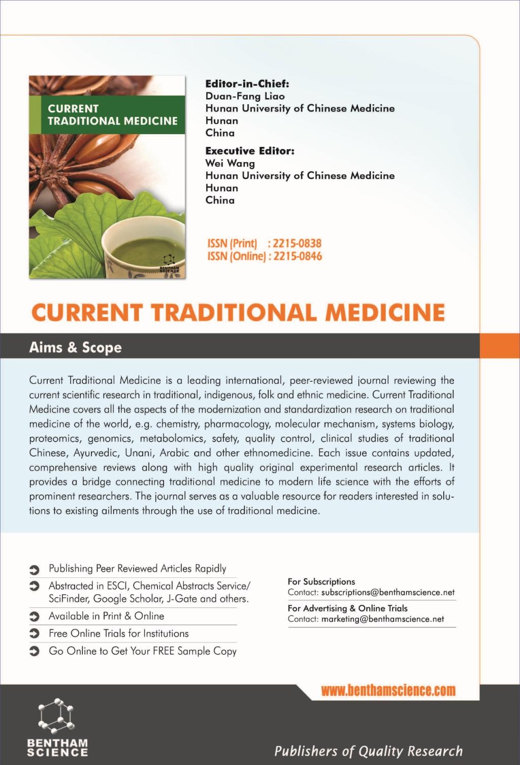 《CURRENTTRADITIONAL MEDICINE》于2015年6月正式创刊,在全球正式发行,由生物医学诺贝尔奖获得者Ferid Murad任名誉主编、yl23455永利官网廖端芳教授任主编、yl23455永利官网院长王炜教授任执行主编,其编委均为国内外业内权威、知名专家,外籍专家比例达到70%。目前,本刊收录于Emerging Sources Citations Index(ESCI),Chemical Abstracts Service,SciFinder,Google Scholar,J Gate,Scopus等国际著名数据库。