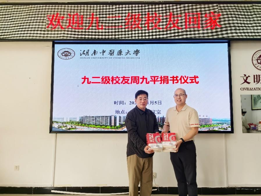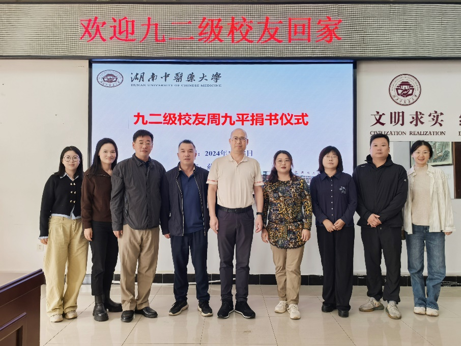 11月5日,九二级校友周九平捐书仪式在闻道楼四楼会议室举行。yl23455永利官网党委书记张熙,院长王炜,副院长童巧珍,湖南醇健制药科技有限公司总经理易十文(92级校友)参加捐书仪式。