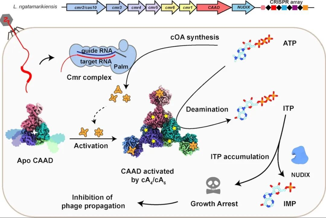 该研究首先通过生物信息学分析挖掘到一类III型CRISPR-Cas下游缺失了广泛分布的核酸酶模块,取而代之的是一个融合了第二信使识别结构域的脱氨酶CAAD(CRISPR-Cas-associated adenosine deaminase),以及一个可能降解核苷的Nudix水解酶。表明该类系统的作用机制可能完全不同于已知的通过切割核酸实现免疫的CRISPR-Cas系统。然后通过体外重组,成功纯化得到了负责识别外源核酸的Cmr复合物。接下来利用MALDI-TOF技术证明该效应复合物通过互补配对识别外源核酸后,会利用ATP生成cA3/cA4/cA6三种环化腺苷。为确认第二信使,测定了不同环化腺苷对CAAD脱氨酶的亲和力,发现cA4和cA6均与CAAD有着极高的亲和力,而cA3几乎不会和CAAD结合。出乎意料的是,生化分析表明在该系统中,cA4和cA6均能高效激活CAAD的脱氨酶活性,并特异性地将ATP转化成ITP。进一步的生化实验证明CAAD下游的NH酶可特异性地将ITP降解成IMP,减少ITP的蓄积导致的细胞毒性,发挥解毒功能。最后通过体内实验验证了该类III型CRISPR-Cas系统在Cmr复合物以及CAAD-NH的协同作用下,可以抑制被外源核酸侵扰细菌的生长,达到群体免疫的作用。