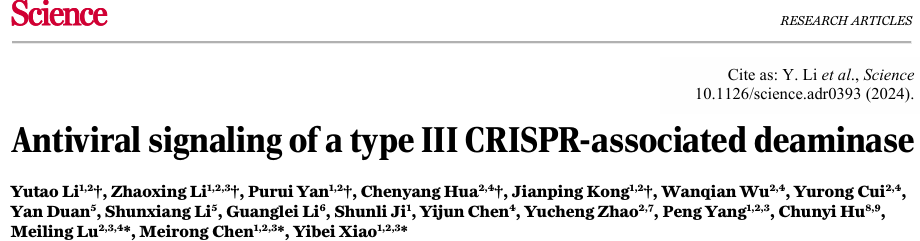 12月12日,永利官网李顺祥教授,中药学博士生段彦参与的中国药科大学肖易倍教授团队牵头的CRISPR-Cas调控ATP消耗抗病毒机制研究,以yl23455永利官网作为论文合作单位,在国际著名期刊Science(中科院一区TOP,IF:44.7)上发表题为Antiviral signaling of a type III CRISPR-associated deaminase的文章。